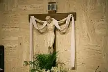 The sanctuary wall is polished buff travertine. The steps and raised surfaces in the sanctuary are of contrasting walnut travertine. The altar is a single block of polished marble weighing 7000 pounds. Within the altar are relics from St. Clement, St. Irenaeus, and St. Aurelius. The sanctuary itself is oval-shaped and was designed specifically for ceremonies in which the bishop presides and for post-Vatican II liturgy. The cathedra or bishop's throne sits immediately beneath the bishop's coat of arms, which hangs on the sanctuary wall. The crucifix with a corpus of walnut travertine is suspended from the wall. The corpus is 5 feet (1.5 m) tall and weighs over 450 pounds (200 kg).
