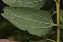 Ceanothus velutinus grows up to 4 meters tall but generally remains under three, and forms colonies of individuals which tangle together to form nearly impenetrable thickets.[2] The aromatic evergreen leaves are alternately arranged, each up to 8 centimeters long. The leaves are oval in shape with minute glandular teeth along the edges, and shiny green and hairless on the top surface.
