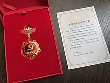 Since June 2021, the "Glorious 50 Years in the Party" Commemorative Medal has been awarded, and the award will continue until 1 July. It consists of the party emblem, a five-pointed star, the flag, a monument, a sunflower, and other elements.[33] The CCP award ceremony to present the 1 July Medal to outstanding CCP members took place on 29 June 2021.
