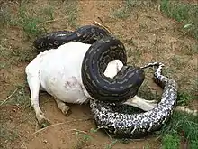 Like all pythons, the Central African rock python is non-venomous and kills by constriction.[21][23] After gripping the prey, the snake coils around it, tightening its coils every time the victim breathes out. Death is thought to be caused by cardiac arrest rather than by asphyxiation or crushing.[21] The African rock python feeds on a variety of large rodents, monkeys, warthogs, antelopes, vultures, fruit bats, monitor lizards, crocodiles, and more in forest areas,[8] and on rats, poultry, dogs, and goats in suburban areas. It will sometimes take fish as well.[33] Occasionally, it may eat the cubs of big cats such as leopards, lions, and cheetahs, cubs of hyenas, and puppies of wild dogs such as jackals and Cape hunting dogs.. However, these encounters are very rare, as the adult cats can easily kill pythons or fend them off.[34][11] On March 1, 2017, a 3.9-m (12-ft 10-in) African rock python was filmed eating a large adult male spotted hyena weighing 70 kg (150 lb). This encounter suggests that the snake might very well be capable of hunting and killing larger and more dangerous animals than previously thought.[35] The largest ever recorded meal of any snake was when a 4.9m African Rock Python consumed a 59-kg impala.[36]