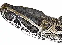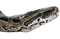 The Central African rock python's body is thick and covered with colored blotches, often joining up in a broad, irregular stripe. Body markings vary between brown, olive, chestnut, and yellow, but fade to white on the underside.[20][8] The head is triangular and is marked on top with a dark brown “spear-head” outlined in buffy yellow. Teeth are many, sharp, and backwardly curved.[21][8] Under the eye, there is a distinctive triangular marking, the subocular mark.[20] Like all pythons, the scales of the African rock python are small and smooth.[8][22] Those around the lips possess heat-sensitive pits, which are used to detect warm-blooded prey, even in the dark.[21][22][23] Pythons also possess two functioning lungs, unlike more advanced snakes, which have only one, and also have small, visible pelvic spurs, believed to be the vestiges of hind limbs.[22][23]