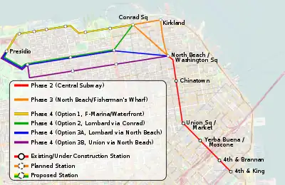 Route for second phase (under construction as the Central Subway), planned route for third phase (extension to Fisherman's Wharf), and proposed routes for fourth phase (extension to the Presidio of San Francisco). The Phase 2 tunnel runs as far as the proposed North Beach station site, but does not include the station.