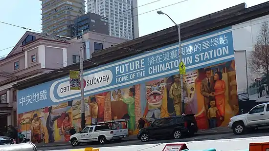 Temporary artworks were also installed during construction. "One Hundred Years: History of the Chinese in America", a mural painted by James Leong originally for the Ping Yuen housing project in Chinatown, was enlarged, printed, and wrapped in 2012 around the Hogan & Vest building at Stockton & Washington, at the future Chinatown station site, prior to that building's demolition.[90] In addition, temporary murals were painted on the construction barricades erected around the Chinatown and Yerba Buena/Moscone stations.[91] The art was printed on adhesive vinyl and wrapped onto the plywood panels, measuring approximately 8 ft (2.4 m) high by 190 ft (58 m) long at Chinatown, along Stockton, or 160 ft (49 m) long at Yerba Buena/Moscone, along Folsom.[92] Temporary art was also installed around the Pagoda Palace Theatre from 2014 to 2017, while it was being used to extract the two tunnel boring machines.[93]