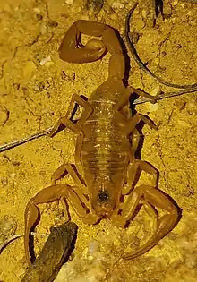 The Baja California bark scorpion is a scorpion that belongs to the Centruroides genus and exilicauda species and is one of the 529 species of scorpions around today and one of the 41 bark species of scorpions.[4][5] They are native to the Western parts of North America, including Baja California, California, Arizona, and New Mexico.[6][3] They have also been seen around the Colorado River.[7] C. exilicauda ranges in length from 1.5 inches to 3 inches. Their tails are 1/16 of an inch wide.[5] The C. exilicauda exoskeleton can appear in a yellow to light brown to gold color which is ideal for their surrounding environment.[5] There are two main differences that can distinguish the Baja California bark scorpion from other scorpions. First is the subaculear tooth that is at the end of their stinger. Second is the fact that Baja California bark scorpion rest their tails on the ground, as opposed to other scorpions who rest their tail in an arch over their back.[8]