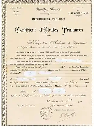 The certificat d'études primaires (CEP) was a diploma awarded at the end of elementary primary education in France (from 11 to 13 years inclusive until 1936) and certifying that the student had acquired basic skills in writing, reading, mathematics, history, geography and applied sciences. It was officially discontinued in 1989.