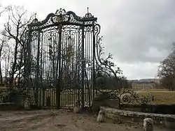 The château (in 2006) with François Olivier's iron grillwork gate bearing the family arms