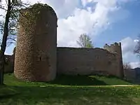 In an almost pentagonal plan, the remains of the castle consist of four towers with an entry pavilion. The western side of the enceinte comprises a residential building with a tower at each end. The southern face is in two parts, to the left there was a residential building now destroyed. Two towers have arrowslits and appear to be from the 13th century, as do their curtain walls and the lower parts of the western building. The latter was remodelled during the 16th century and has mullioned windows. It contains chimneys and a spiral staircase in the tower. The entry building must be from the beginning of the 17th century, and still has traces of the chains and the platform of the old drawbridge. The building on its left, also 17th century, has a watch tower. At the bottom of the southern curtain wall is a 13th-century postern. The house in the centre of the courtyard is 16th century, as is the well with armorial bearings located in the second courtyard. [1]