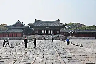 - Myeongjeongjeon is the palace's main hall, where state affairs such as meetings with officials and royal banquets were held.[3] First built in 1484, it was burned down during the Japanese invasion of 1592. Rebuilt in 1616, it is the oldest main hall of all the palaces in Seoul.[3] It is smaller than the two-story main halls of Gyeongbokgung and Changdeokgung because it was originally built as the queen's living quarters, rather than as a throne hall.[3] Although it is a simple, one-story structure, Myeongjeongjeon was built on an elevated stone yard that imbued it with the dignity of the main hall. Running through the courtyard in front is a three-level walkway whose centre path was for the king's use only.[3] Surrounding the entire area is a wall-like structure of single-room units which were used by the royal guards or for royal funerals. Myeongjeongjeon is designated as National Treasure 226.