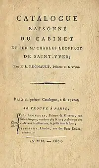 Catalogue of 1805 public auction : Catalogue raisonné du Cabinet de feu Mr. Charles Léoffroy de Saint-Yves. Estampes, tableaux, dessins, miniatures, sculptures, livres etc... Paris, 1805, F.L. Regnault, peintre & graveur et Silvestre, libraire