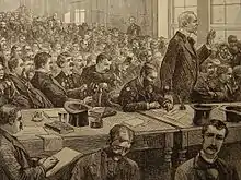 Guiteau's interest then turned again to politics. During the 1880 presidential campaign, the Republican Party was largely split into factions – the Stalwarts, led by Roscoe Conkling, who supported Grant for a third term, and the Half-Breeds, who supported James G. Blaine. Guiteau decided to support the Stalwarts and wrote a speech in support of Grant called "Grant against Hancock", which he revised to "Garfield against Hancock"[19][20] after Garfield (not affiliated with either faction) won the Republican nomination. Ultimately, Guiteau changed little more in the text than switching Grant's name to Garfield's.[21] The speech was delivered at most twice, and printed copies were passed out to members of the Republican National Committee at their summer 1880 meeting in New York, but Guiteau believed himself to be largely responsible for Garfield's victory over Democrat Winfield Scott Hancock that November.[22] He insisted he should be awarded a consulship for his supposedly vital assistance, first asking for Vienna, then deciding that he would rather have the one in Paris.[22] Guiteau's personal requests to Garfield and his cabinet as one of many job seekers who lined up every day to see them in person were continually rejected, as were his numerous letters.[22]