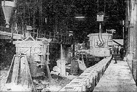 Sandford had left a half-completed 24-inch rolling mill—for rolling heavy sections such as rails—but, when the new management completed it and tried to use it, it broke down. Hoskins imported parts for this mill, including a more powerful steam engine to drive it, and reworked its design to create a 27-inch mill.[60][69] New reheating furnaces were built to suit rail rolling.[70] It would take until 1911 for Lithgow to produce the first steel rails made in Australia.[71][72] The works won contracts to supply rails for the new Trans-Australian Railway.[1][73] and later, once again, the New South Wales Government Railways.[55] Sandford's plans for Lithgow had provision for up to four blast furnaces.[74] G & C Hoskins quickly built a second blast furnace—with its parts made at Hoskins' own works at Lithgow and Ultimo—which was almost identical to Sandford's, but slightly larger. This new furnace opened in 1913. They built a short rail line from the blast furnaces to the steel furnaces, allowing the pig iron to transferred in a molten state, using 30-ton capacity ladle cars. They added a new larger open hearth steel furnace that produced larger steel ingots to suit the new 27-inch mill. To match the increased production, more coke ovens were built.[69]