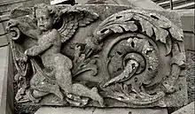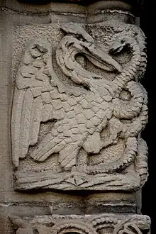 St Michael & All Angels' church, Barton-le-Street, Ryedale, North Yorkshire, first constructed in the 1160s, is a Grade I listed building.[20] Its mediaeval carvings "suggest that masons and stone-carvers who had worked on the cathedrals at York or Durham may have been employed here. Their work shows influence from Western France and Lombardy in the great Norman tradition of stone-carving."[21] It was rebuilt with "stone from the Whitby and Appleton quarries"[22] The "Victorian decorative detail and sculpture [is] generally in Birdsall sandstone; medieval sculptural decoration [is] in Hildenley limestone."[23]