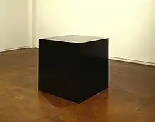 Ray recapitulated many of the developments in twentieth-century sculpture in his first show in 1971 with an installation entitled One-Stop Gallery. The show consisted of a collection of small sculptures, resting directly on floor. Some of the works, in their attention to materials, were clearly inspired by minimalist artists like Robert Morris, while two small constructed steel sculptures invoke the traditions taught by his teacher, Brener; they were even painted the same red as Caro's Early One Morning (1962, Tate Modern). One-Stop Gallery would anticipate the tone for much of Ray's work to come in its plumbing and reinterpreting of the canon of twentieth-century sculpture without having his own work appeal to any particular period or style. Initially influenced by Caro, by including his own body in his works he made them more like documented performances. In the two-part photographic work Plank Piece I–II (1973), for example, he pinned his body to the wall with a large piece of wood.[8] In the late 1980s, Ray conceived minimalist works using ink and wire. In Ink Box (1986), a large cube is filled to the brim with ink, giving the illusion of a solid cube. Ink Line (1987) is a continuous stream of black ink traveling from a dime-size opening in the ceiling into a similar hole in the floor. In Spinning Spot (1987), a section of the floor measuring 24 inches in diameter is set spinning at 33 RPM. Consisting of a single 8.5 foot length of wire, both ends of Moving Wire (1988) protrude from the wall and are set 14 inches apart; as one end of the wire extends out from the wall at random intervals, the other retracts.[9] For Unpainted Sculpture (1997), over the course of two years, Ray reconstructed a life-sized crashed Pontiac Grand Am (circa 1991) out of fiberglass, casting and assembling each piece to match the bent and twisted forms of the original [10] Despite the work's title, it is painted a soft dove grey that is reminiscent of the plastic parts of model car kits.[11]