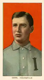 Carr served as a player-manager for the Indianapolis Indians of the American Association from 1906 to 1910.[3] On July 27, 1906, Carr entered the crowd during a game in Indianapolis and struck a spectator three or four times in the head, knocking him down and causing him to sprain his wrist. He was tried for assault in August but acquitted due to a jurisdictional technicality.[11] His 1908 Indianapolis team won the American Association pennant with a 92-61 record. Carr hit .301 in 522 at bats in 1908. Other key players on the 1908 team included Rube Marquard, Donie Bush, and Ed Siever.[12] The Indians drew 500,000 spectators in 1908.[2] Jack Hayden, who led the 1908 team with a .316 average, credited Carr with the team's success: "We have played under a leader who sympathizes with us. He always had courage and instilled courage in the team. We have been a happy family and it is with a great deal of regret that we part."[13]