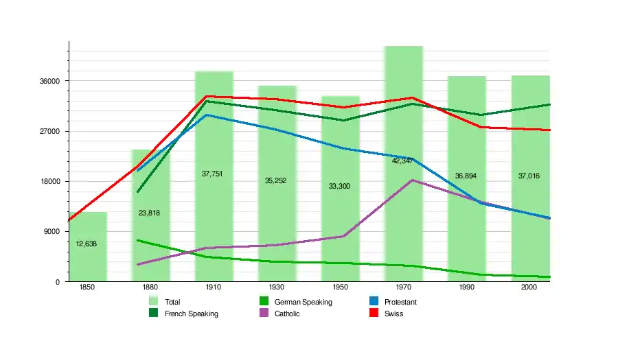 As of 2008, the population was 48.0% male and 52.0% female. The population was made up of 12,444 Swiss men (33.2% of the population) and 5,578 (14.9%) non-Swiss men. There were 14,513 Swiss women (38.7%) and 4,988 (13.3%) non-Swiss women.[19] Of the population in the municipality, 15,164 or about 41.0% were born in La Chaux-de-Fonds and lived there in 2000. There were 3,778 or 10.2% who were born in the same canton, while 6,962 or 18.8% were born somewhere else in Switzerland, and 9,651 or 26.1% were born outside of Switzerland.[18]