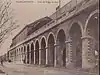 The Ouest company, in light of the upcoming 1900 Universal Exposition, was granted a concession on 6 July 1896 to extend its Moulineaux line from its Champ de Mars terminus to a new 'Invalides' station;[56] the Ouest not only extended its line, but lowered its river-hugging length into a trench to eliminate its railway crossings at every bridge and added four new, minuscule, Chinese-pagoda-esque stations: travelling from the Ceinture inwards, one passed 'pont Mirabeau' (later 'Javel'), 'pont de Grenelle', 'de la Bourdonnais' and 'pont de l’Alma' before reaching the 'Invalides' terminus. Not concerning the Ceinture directly, but attached to this extension, was another Ouest project approved on 14 June 1897: the 'Boulanvilliers' line extension that, crossing the river on a 'viaduc de Passy' just below the pont de l'Alma, would allow Ceinture and St-Lazare passengers a much shorter trip between the city centre and the Champ de Mars. It was an extensive project: the Paris-Auteuil ravine between Courcelles-Levallois and Passy was widened into a straight-walled trench wide enough to accommodate two additional sets of rails to either side of the existing line: below the 'Avenue Henri Martin' station, the new lines entered curving tunnels to pass below the Paris-Auteuil lines to emerge at a new entrenched 'Boulanvilliers' station before, after passing through another tunnel, emerging on the river-crossing viaduct that curved left to meet the path of the Moulineaux line rails towards the Champ de Mars and Invalides terminus.[57]