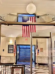 The courthouse is located at the corner of Central and Peachtree Streets. The Classical Revival building, built in 1926 to a design by James J. Baldwin, was the second built on the site. The prior courthouse on the site burned twice, but after the second fire was not salvageable. The blue marble-faced two story building has a five-bay diagonal section facing the roadway that forms its entrance. It has a four-columned Corinthian Greek portico, and is topped by a monumental cupola which rises well above the structure. All the blue marble used for the construction was quarried locally from area mines. The building interior, especially its courtroom, has retained much of its original woodwork and stone styling.[2] The courthouse underwent a substantial remodel around 2011, which modernized the interior, but in turn cost the building some of its original interior features. The remodel also added additional court rooms, and offices to the rear section of the building. The old Cherokee County Jail which was built in 1922 was demolished in order to make room for the new addition. The copper lantern which sits atop the dome, was removed around 2017 to make crucial repairs to the lantern. It was in danger of collapsing in on itself, due to structural deterioration over the years, as well as being riddled with bullet holes. The lantern was restored locally with help from The Cherokee County Board of Commissioners, the Cherokee County Maintenance Department, Tri-County Community College Welding Department, as well as numerous other skilled local residents.