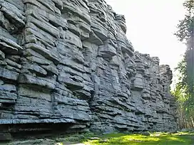 The rock formation at Chertova Gorodishche is 20 meters tall and located on top of a wooded mountain. The formation extends up the side of the mountain to the crest of a ridge, where the most prominent rocks are located. The rock making up the formation is composed of granite (part of the Verkh-Isetsky granite massif) with younger sedimentary rocks on top.[1]