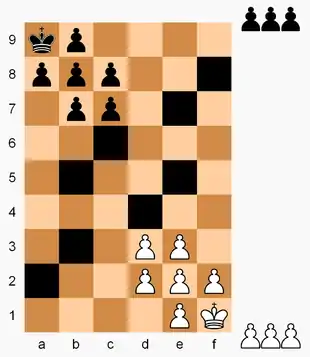 Chessence is a chess variant invented by Jim Winslow in 1989.[1][2] The board is a 6×9 rectangle of squares with eight squares missing (blackened out in the diagram). Each player has a king and nine men with initial setup as shown, including three men initially not yet in play at the side of the board. To win, a player must checkmate or stalemate the opponent.