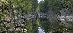 Chesterfield Gorge was initially carved from the metamorphic bedrock by torrents of glacial meltwater. Today, the gorge continues to be shaped by the East Branch of the Westfield River. The walls of the gorge are quite steep, more than 30 feet (9.1 m) in some places. During periods of low water, it is possible to get down to the floor of the gorge, but it is not recommended, and no trails exist from the cliff edge to the bottom. Rock climbing is prohibited. The surrounding forest features oak, pine, and hemlock, and is home to bears, bobcats, and turkeys, among many others. A half-mile trail along the cliff top offers views of the gorge, the river, and the forest. A railing runs along the length of the cliff for safety. Along the cliff ledge are fields of boulders, some of which are quite massive.