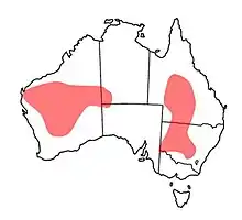 The chestnut quail-thrush occurs in a relatively large area across the interior of Australia, covering both semi-arid and arid landscapes. The nominate species of Cinclosoma castanotum is found in central Queensland, extending down through western New South Wales and continuing south as far as Cobar.[3] The race marginatum occurs from the far southwest corner of the Northern Territory across to Shark Bay in WA and as far south as Kalgoorlie. The distribution and habitats of the chestnut quail-thrush are naturally fragmented due to natural landscape breaks, such as the Eyrean Barrier, Murchison Barrier and the desert landscapes of the Yellabinna Region – landscapes that do not support mallee or heathland and thus a lack of suitable habitat.[7]