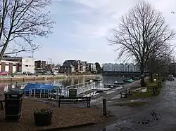 Proposals for a canal linking Chichester directly to the sea go back as least as far as 1585 when an act of parliament was passed allowing a cut linking Chichester with the sea.[2] Further proposals were made in the early 19th century, with schemes being proposed in 1801, 1802, 1803 and 1811, but none of these came to pass and as a result the first link to the sea was via a branch of the Portsmouth and Arundel Canal opened in 1822.[2] In 1817 it had been decided that the section between Chichester and Chichester Harbour, unlike the rest of the canal, would be built large enough to carry boats of 100 tons.[2] Putting this into practice required a new act of parliament which was obtained in 1819.[3] In the same year the construction of the Chichester branch began.[4] In digging out of the basin a hoard of 300 Denarii was found.[5] The section of the canal that would become the Chichester Canal was formally opened on 9 April 1822[6]