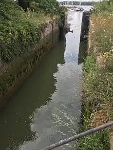 The Chichester Canal is a ship canal in England, currently navigable at either end, save for two low-level modern bridges obstructing the middle of the route. Its course is essentially intact, 3.8 miles (6.1 km) from the sea at Birdham on Chichester Harbour to Chichester through two locks. The canal (originally part of the Portsmouth and Arundel Canal) was opened in 1822 and took three years to build. The canal could take ships of up to 100 long tons (100 t). Dimensions were limited to 85 feet (26 metres) long, 18 feet (5.5 m) wide and a draft of up to 7 feet (2.1 m).[1] As denoted by the suffix -chester, Chichester is a Roman settlement (Noviomagus Reginorum), and 300 Denarii were unearthed when Chichester Basin was formed in the 1820s.