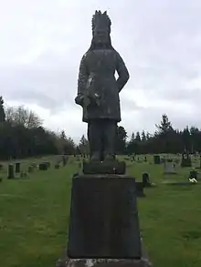His remains were interred in a canoe, per Chinook custom, in the family burial ground.[16] In 1835, Comcomly's elongated skull was stolen from his grave by Hudson Bay Company physician Dr. Meredith Gairdner and sent to Scotland for scientific study.[15] It was displayed in England[5] at the Royal Naval Hospital Haslar Museum. Although damaged in The Blitz during World War II, the skull was eventually sent to the Clatsop County Historical Society in Astoria in 1953, and then to the Smithsonian Institution in 1956.[17] In 1972, Conconmly's skull was finally repatriated to Chinook tribal members for reburial.[18]