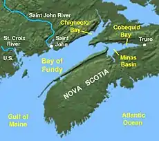 Chignecto Bay is derived from the Amerindian sigunikt, said to mean "foot cloth", possibly alluding to a Micmac legend.[3]