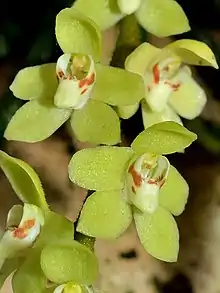 Chiloschista segawae is a species of leafless epiphytic or orchid that forms clumps with many radiating, flattened green roots. Up to fifteen, whitish green or yellow flowers are arranged along a pendulous flowering stem. It grows on trees in forest on Taiwan.