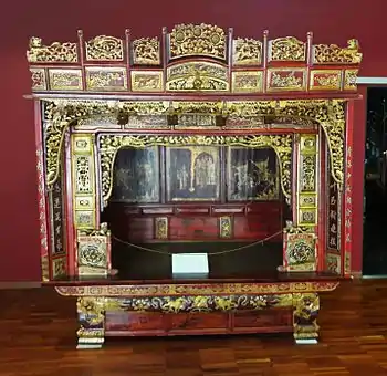 The foremost Teochew betrothal gift is the sì diǎnjīn (四點金), four pieces of jewelry including a gold necklace, a pendant, a pair of earrings and a bangle selected by a groom's mother and presented to the bride during the tea ceremony.[11][17] Since sì diǎnjīn is also the name of a traditional Chinese architectural style, a four-pointed curved roof found in traditional homes, the jewelry symbolizes a blissful union in a secure home.[17]