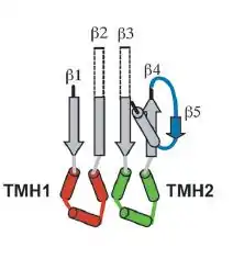 Six short α-helices in D3 unfold to form two transmembrane β-hairpin (TMH), TMH1 (red) and TMH2 (green).[8]