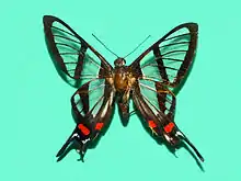 Chorinea licursis has a wingspan reaching about 30–35 millimetres (1.2–1.4 in). These butterflies are quite variable with respect to the size of the transparent region and of spots on the hindwings. They have transparent wings outlined with black and long tails on the hindwings. Forewings and hindwings are crossed by black veins and by two black transverse bands. At the base of the hindwing tails there are bright red marks. Adults are usually found from March to June.[2] Larvae feed on Celastraceae (mainly Maytenus ilicifolia and Prionostemma species).[2]