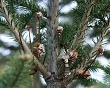 Balsam fir is the most susceptible host to outbreaks of the spruce budworm. Annual defoliation of current-year growth for 5 to 8 years will kill the host tree.[16] Defoliation by the spruce budworm is most clearly reflected in the fir's radial growth. The population of mature balsam fir in a forest is greatly reduced by a combination of factors: its shorter lifespan and a great vulnerability to lethal budworm attacks.[19][20][21] The dietary preference for balsam fir over white spruce has the potential to alter the structure and composition of spruce-fir forests. Similarly, the next-generation stand of trees are influenced by the late instar larvae that disperse to the understory of the forest and feed on the regeneration of plants.[18] During a 1957 budworm outbreak in Quebec, balsam fir mortality was greater than 75% in stands in which no mortality was reported among the smaller component of white spruce.[22]