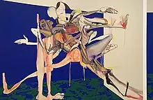 The titles of her works often allude to a written and spoken vernacular.[6] The content of her work features many distorted, often naked, human forms. She contorts and twists the bodies, making the limbs interact with different layers/dimensions of the artwork, to show a profusion of perspectives. In her personal life, her racial and sexual identity of being a black, queer, cisgendered woman is often mistaken, so the multiplicity of her work is seen as a link to those personal experiences and qualms with misrepresentation.[7][8][9][10] Quarles frequently depicts couples in erotic, if improbable poses.[11][12]