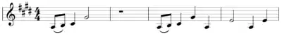 This is repeated until (0:36) when a second guitar begins to double the melody, with slight variations. At (1:12), one of the guitars begins to play a counter-melody, and at (1:28), the bass guitar also begins a counter-melody. At (1:47), both guitars begin playing the first counter-melody. At (2:04), one of the guitars begins playing another counter-melody, until (2:57), when the guitars begin doubling themselves again. At (3:14), the bass guitar ceases playing and the guitar strumming becomes more predominant, until (3:47), when the bass guitar suddenly begins playing a loud, slightly distorted counter-melody. The instruments build up in a gradual crescendo, increasing in volume and tempo, until (4:39), when the drums enter and the guitars strum a chord structure based around the chords of C♯ minor, C♯ suspended 2nd, and A major. At (5:14), the guitars suddenly turn distorted, repeating the chord structure until (5:43), where one of the guitars plays a solo. At (6:10), the guitars strum a C♯ minor chord until (6:18), where the guitars turn clean and the chord structure is reintroduced. At (6:29), a violin solo begins playing quietly in the background; the reason for the quietness being the song using the same solo as recorded by Luke Sutherland for "Xmas Steps", which was played significantly faster.[1] At (6:34), the guitars begin the last counter-melody of the song, doubling each other with noticeable variations. The drums cease playing at (7:10), leaving the guitars playing their melodies, and gradually slowing down in a diminuendo with the violin solo playing faintly in the background, until (10:28), when the guitars cease playing, ending on a C♯, which fades out.