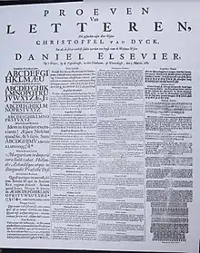 Van Dijck apparently had a strong reputation in his lifetime and beyond, aided by the connection between Protestant Britain and the Dutch Republic. Marshall considered him a "famous artist".[57] Moxon, who spent time in the Netherlands as a child and later met van Dijck on returning as an adult, wrote soon after his death that "Holland letters in general are in most esteem, and particularly those that have been cut by the hand of that curious artist Christofel van Dijck, and some very few others...when the Stadthouse at Amsterdam was finishing, such was the curiosity of the Lords that were the Overseers of the building, that they offered C. van Dijck aforesaid 80 Pounds Sterling (as himself told me) only for drawing in paper the names of the several offices that were to be painted over the doors, for the painter to paint by"[58] and also praised them extensively in his Mechanick Exercises of 1683.[59] Many, although not all, of his types are also identified in the Enschedé type foundry specimen dated 1768,[lower-alpha 5] specifically his smaller types and blackletters from the middle of the book.