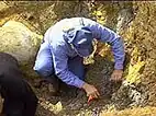 In 1942, Stewart, of the Missouri Geological Survey, had been examining clay near Glen Allen when he came upon a boy who led him to the family at work digging.[4] According to Stewart, property owner Lulu Chronister had found several "unusual" bones while digging and had saved them. They had been found about 8 feet (2.4 m) deep in the Chronisters' well, which had an overall depth of 24 feet (7.3 m), "imbedded in a black plastic clay."[5] Stewart reported his discovery to the Smithsonian Institution, which bought the remains, specimen USNM V16735, consisting of thirteen caudal vertebrae, from Chronister for US$50, which was later used to purchase a cow.[3][4] Two other bones, of unknown type, were also recovered from the site, while one additional vertebrae had been given by Lulu Chronister to a friend.[5] At the Smithsonian, the bones were analyzed but the species from which they originated was incorrectly identified.[3][4][6] They were later placed in the genus Parrosaurus.[5][7]