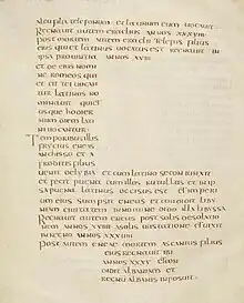Only the Latin translation of the Excerpta survives and in a single manuscript. It is not the autograph of the translator, but the original good copy made from his drafts and thus dates to the 770s or 780s and was made at Corbie. Its shelfmark today is Paris, Bibliothèque nationale de France, Lat. 4884 (or Parisinus latinus 4884).[22] It is a codex composed of seven quires.[23] It is written in a distinct variety of Caroline minuscule pioneererd by Abbot Maurdramnus, who governed Corbie in 772–781. It has high clarity and is easy to read.[24]