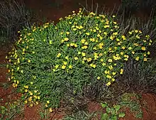 Chrysocephalum pterochaetum, known by the common name perennial sunray is a perennial herb native to outback and desert areas of Australia. A member of the Asteraceae, the daisy family. A small plant, 15 to 40 cm high with many stems. Leaves are linear to linear oblanceolate in shape, 10 to 30 mm long, 1 to 1.5 mm wide. Leaf surfaces are rough and glandular, and may have felty white hairs. Yellow flowers mostly form throughout the year, but often seen from June to October. Originally collected in 1851 near Kanyaka, South Australia. The habitat of this plant includes sand among rocks, in or near dry creek beds, exposed rocky hill slopes and sandy gibber. The specific epithet pterochaetum is derived from the Ancient Greek language, ptero (winged) and chaetum (hair).[1][2]
