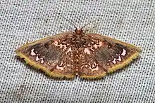 The wingspan is about 20 mm in the male and 26 mm in the female. Antennae of the male are bipectinate (comb like on both sides) to three-fourths length. Hind tibia with two spur pairs. Hindwings with veins 6 and 7 from angle of cell or on a short stalk. Wings with evenly rounded outer margin. Forewings with produced and acute apex. It is generally brownish, but the head, thorax and abdomen are suffused with crimson and the metathorax has two white specks. The forewings have a diffused sub-basal band of pale pink not reaching the costa and with some dark specks on it. A small dark annulus at end of the cell. A submarginal diffused pink band with ill-defined waved dark line on it. Hindwings with sub-basal pink dark-edged band. It has a silvery-white discocellular spot. A diffused postmedial band of pink blotches with some darker marks found on it. Cilia of both wings orange, whereas the ventral side is bright pinkish.[1]