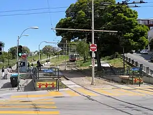 Church and 18th Street station (also known as Right Of Way/18th Street) is a light rail stop on the Muni Metro J Church line, located in the northwest corner of Dolores Park in San Francisco, California. The stop opened with the line on August 11, 1917. The eastbound (inbound) platform is located inside Dolores Park on Muni's right of way; the westbound (outbound) platform is a traffic island on Church Street. Mini-high platforms providing access to people with disabilities are located inside the park next to 18th Street.