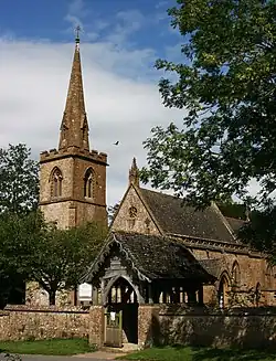 The hamstone building has clay tiled roofs behind parapets. It consists of a three-bay nave, two-bay chancel and north transept. The three-stage tower is supported by corner buttresses and topped with a spire.[1]