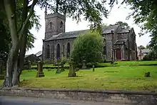 The church and graveyard were consecrated at 11 am on 3 October 1870 by Robert Bickersteth, Bishop of Ripon, although part of the graveyard had already been consecrated by 1862, and the spire was not completed.[3][16] The pews were filled to overflowing when the bishop processed into the church, followed by over thirty local clergymen, all repeating Psalm 24. The bishop read the sentence of consecration, followed by morning prayers. The choir sang, and the almost-completed organ was played for the first time by Samuel Pontefract (1815–1896) of South Crosland.[17] The bishop's sermon was based on Psalm 122, verse 1. He alluded to the recent building work, the need for support from the laity in spirit and funding, and the pressing need for the final £400 required to pay off building costs. The collection amounted to £313 7s 1d. The bishop then processed outside with the clergy, to consecrate the burial ground.[3]