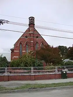 The vicar of Phillipstown, Rev Hannibal James Congdon Gilbert, teamed up with an accountant (James Bowlker) and a storeman (Lewis Aylwin Carrell) to purchase the land for the church for £380 in September 1881. They onsold the Church Property Trustees for a nominal ten shillings in March 1883.[2] The church, constructed in 1885, was designed in the Gothic Revival style with red brick with contrasting bands of stone, reflecting contemporary English architectural style[1] A similarly detailed but larger church, St Johns Cathedral, was designed by Mountfort and built in Napier between 1886 and 1888.[2] This was destroyed by the 1931 Hawke's Bay earthquake and thus left the Church of the Good Shepherd as Mounfort's only surviving brick church.[2]