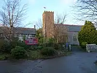 Viewed from south-east, with St Mary the Virgin Church, parish church of Churston Ferrers, at right (east)