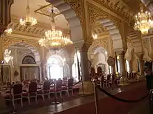 This is the main hall of audience. It is a large room with two thrones at the centre, a set of chairs around, as if in a durbar setting. On the walls of the halls are large format paintings of the Maharajas of Jaipur, a large picchwai (a backdrop for a shrine), large paintings depicting the colourful festival of holi, and a pair of paintings featuring spring and summer (possibly made in the Deccan). On display, you can also see military medals and polo trophies, marking the achievements of the rulers. The room is opulent in its decoration, with murals, and chandeliers. The current closed arches, on which the Holi paintings, and the Spring and Summer portrait hang, were closed in the recent times. Photos from the reign of Man Singh II, of the court in attendance, Lord and Lady Mountbatten's visit, line the corridor leading out to the Sarvato Bhadra courtyard.