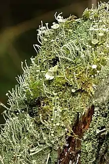 Cladonia coniocraea, commonly known as the common powderhorn or the powderhorn cup lichen,[3] is a species of fruticose, cup lichen in the family Cladoniaceae. It was first described by Heinrich Gustav Flörke in 1821 under the name Cenomyce coniocraea,[1][4] until Kurt Polycarp Joachim Sprengel reclassified it under the genus Cladonia in 1827.[1][2]