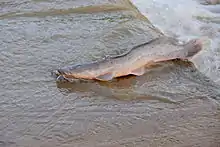 The African sharptooth catfish is a large, eel-like fish, usually of dark gray or black coloration on the back, fading to a white belly. In Africa, this catfish has been reported as being second in size only to the vundu of the Zambesian waters,[2] although FishBase suggests the African sharptooth catfish surpasses that species in both maximum length and weight.[3][4]