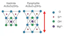 Structure of a two-layer clay, kaolinite (T-O) and pyrophyllite (T-O-T) with red arrow to represent the Z dimension. T-O-T clays are naturally larger in the Z direction because of the extra layer provided by the additional tetrahedral layer.